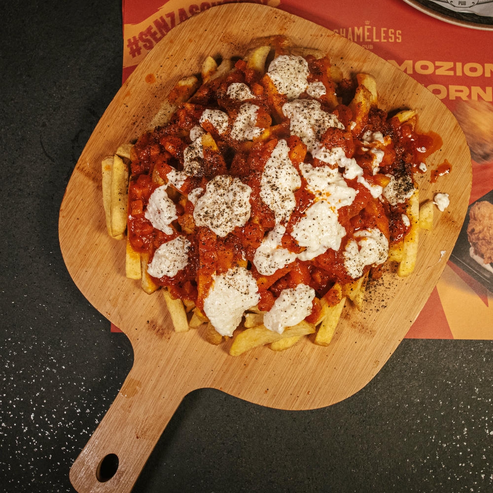 (Pulled Pork, Cheddar, Bacon, Patatine Fritte, Cipolla Caramellata, Salsa Shameless)