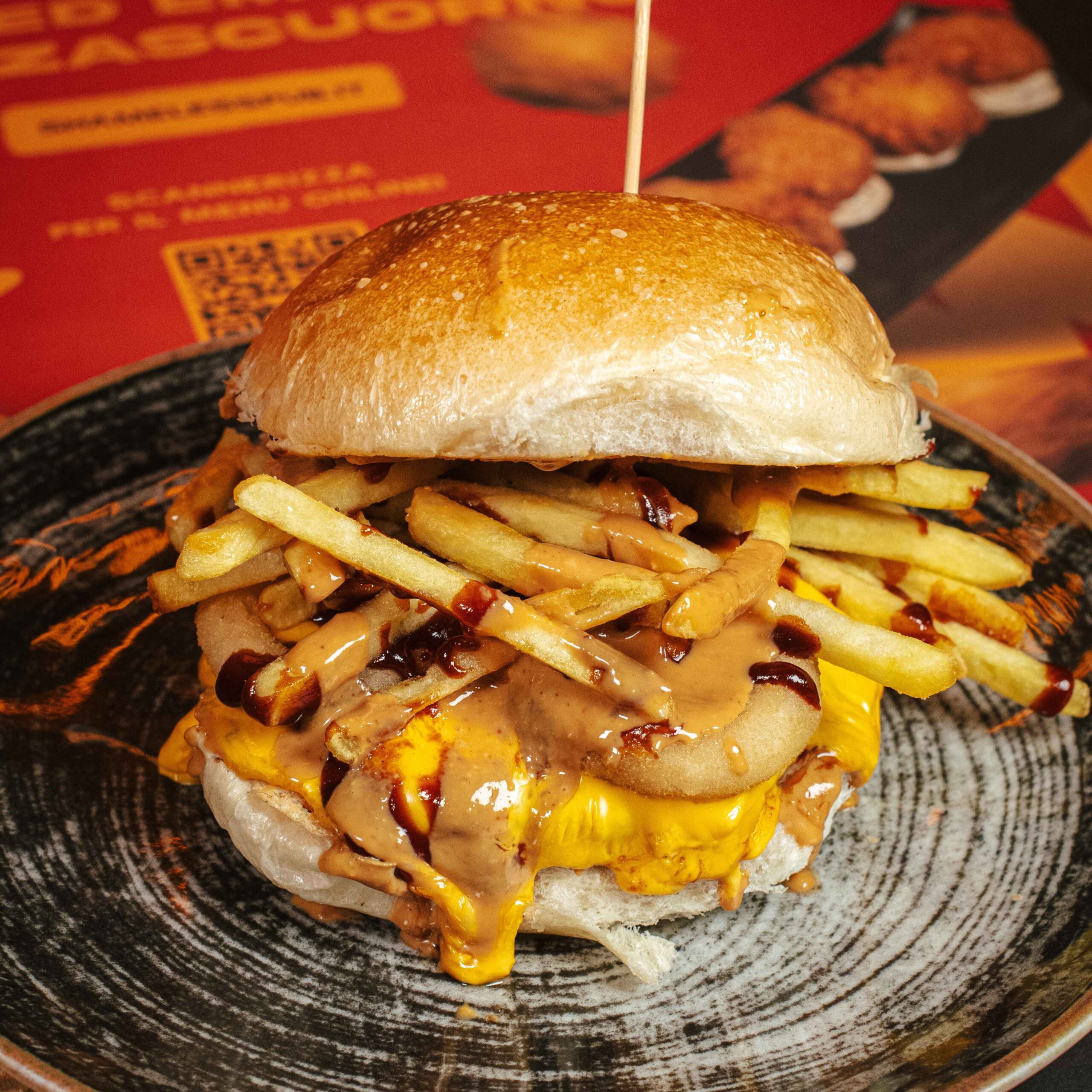 (Hamburger di Scottona 200gr., Doppio Cheddar, Bacon Crispy, Cipolla Crispy, Insalata, Pomodoro e Salsa Shameless Homemade)