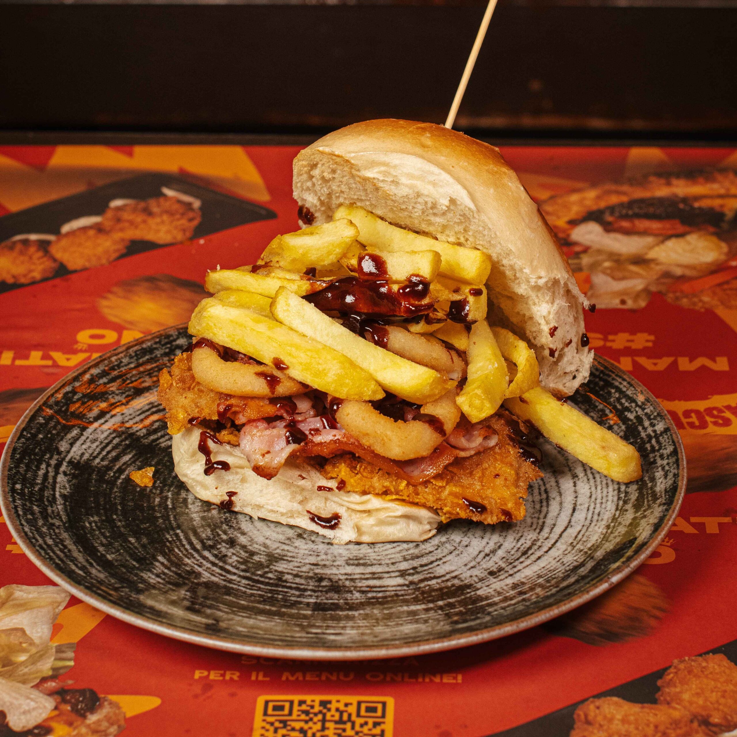 (Hamburger di pollo panato ai cornflakes, formaggio fuso, bacon, insalata, cipolla caramellata, mayo al lime)